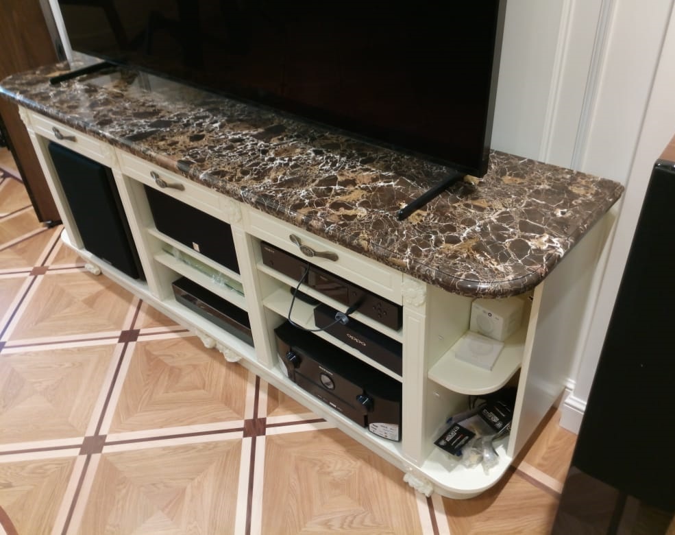 Изготовление и монтаж подоконника и небольшой столешницы для тумбы из мрамора Emperador Gold.