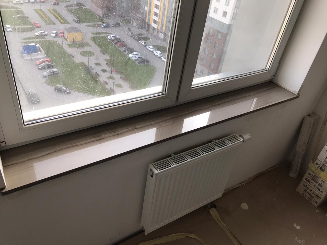 Изготовление и монтаж двух подоконников и балконного порога из Итальянского мрамора Striato Elegante для частного клиента в Санкт-Петербурге.