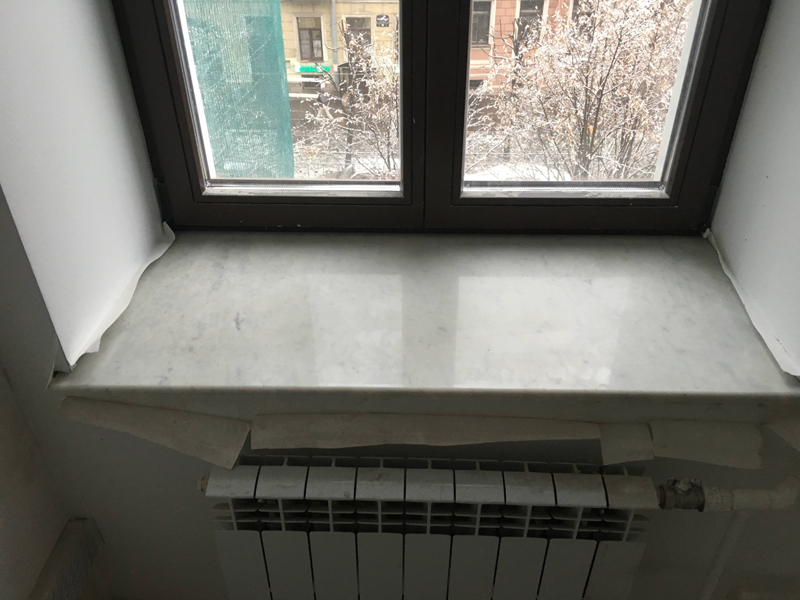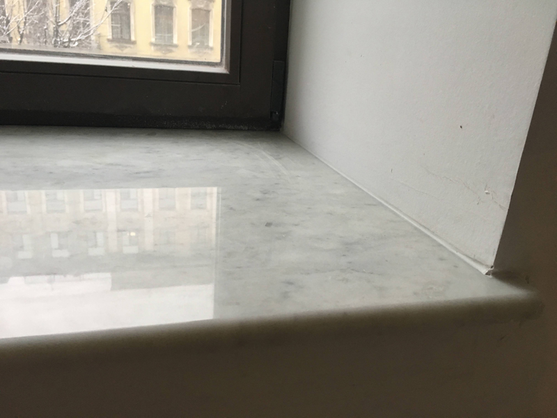 Мы вырезали подоконники из полированных слэбов толщиной в 20 мм. Торцевой профиль также сделан в соответствии с оригиналом — полуваликом.