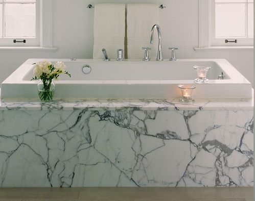 Дизайнер с большим уважением отнесся к красоте итальянского мрамора. Постамент для ванны представляет собой конструкцию из полуслэбов камня. Ведь камень с таким рисунком особенно хорош именно в плитах крупного формата.