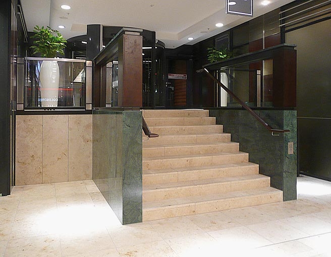 Обратите внимание на балюстраду — она представлена монолитными прямоугольными блоками с обоих сторон от лестницы. Эти элементы облицованы полированными плитами легендарного мрамора Rainforest Green. Он узнается с трудом, поскольку в полировке приобретает глубокий и насыщенный травяной оттенок. Хотя скорее всего камень балюстрады был дополнительно пропитан защитным средством с эффектом усиления цвета.