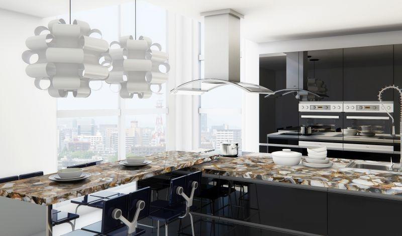 Интерьер современной кухни в черно-белой гамме умело украшен столешницами из Agate Rubane - камня с богатой текстурой. Аналоги этого сорта: Agate Rubane Gold и Agate Rubane Tornado Gold.