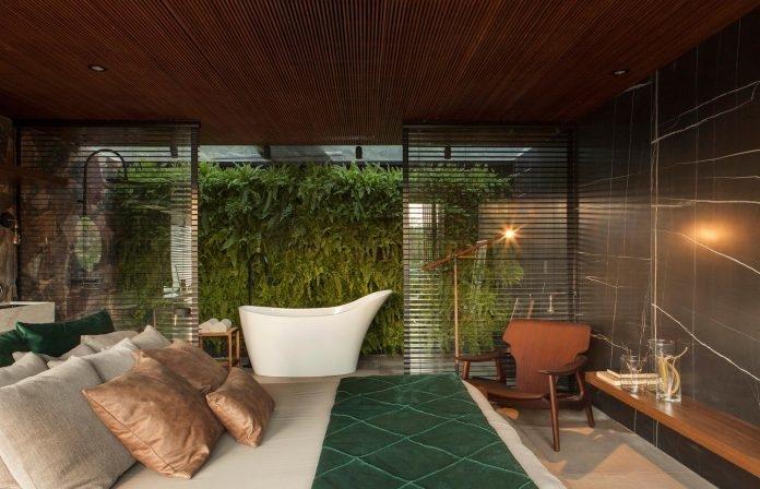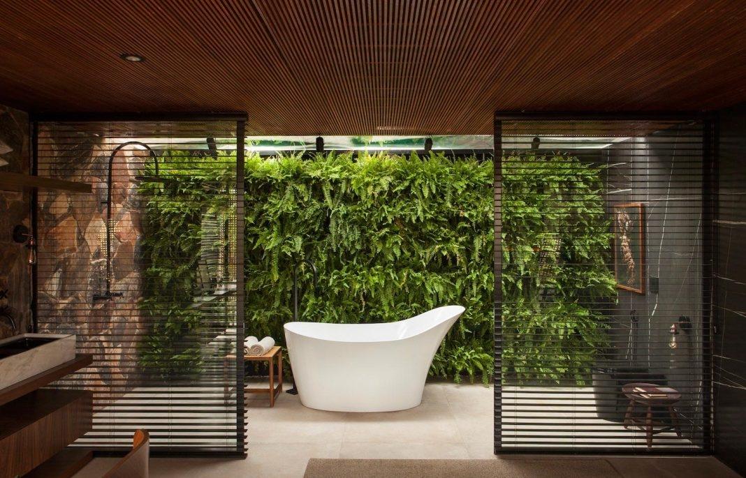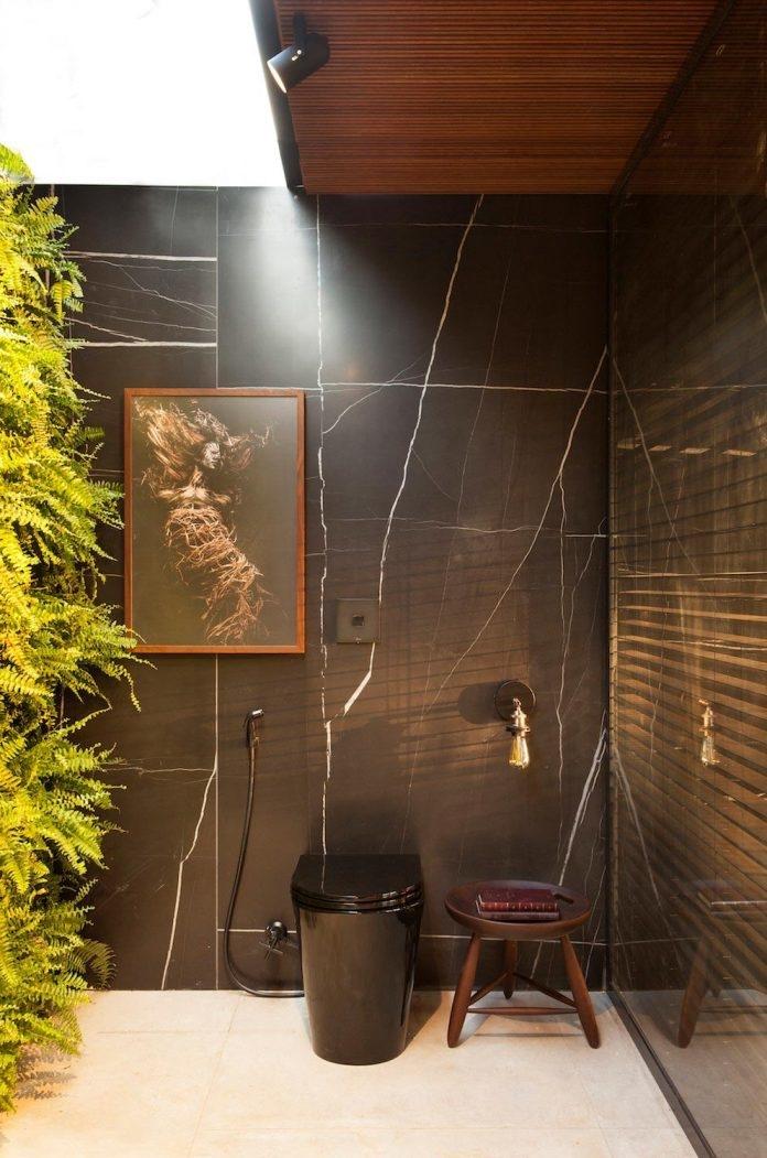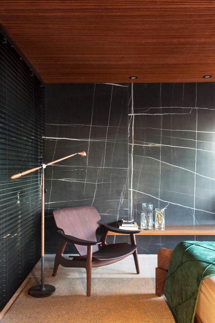 Для отделки стен в загородном доме использовались крупные слэбы мрамора.