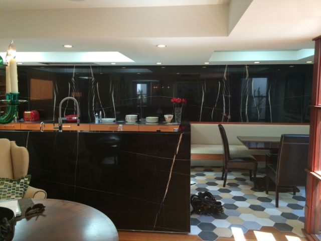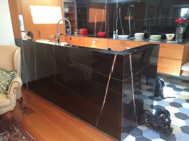 Пространство кухни объединено с гостиной, а стильная барная стойка помогает зонировать помещение, разделить эти две зоны. Боковые части барной стойки облицованы крупными полированными плитами мрамора Sahara Noir - мрамора с графическими жилами на темном, почти черном фоне. Этим же камнем облицованы стены кухни.