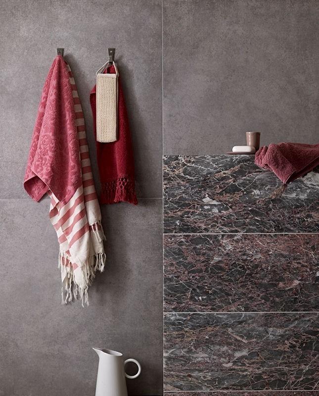 Вы видите весьма оригинальный способ декора ванной комнаты. Заказчик выразил пожелание совместить в интерьере элегантность и минимализм, используя натуральный камень серых оттенков. Стена облицована крупными плитами лощеного серого мрамора с однородной текстурой, а декоративный выступ — изысканным турецким мрамором Salome.