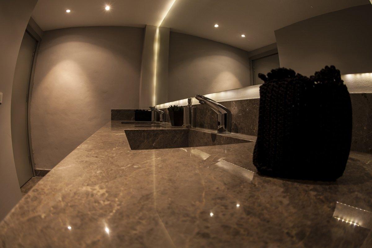 Серо-коричневый прожилковатый мрамор Savana Grey играет главную роль в интерьере уборной.