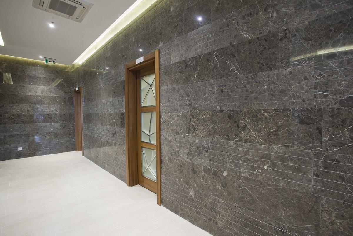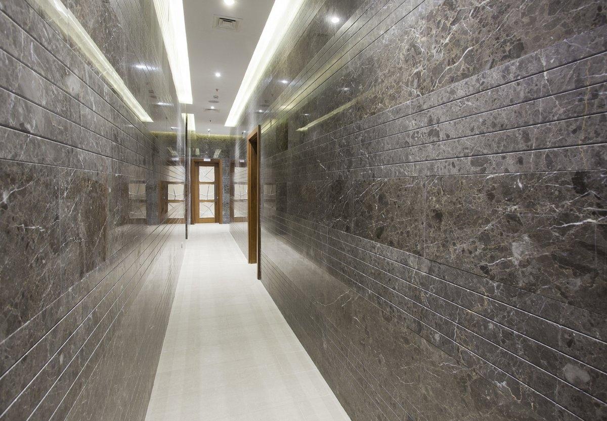 Все стены коридора облицованы серо-коричневым мрамором Savana Grey. Его приглушенный рисунок органично встраиваются в пространство, привнося в него благородство и элегантность.