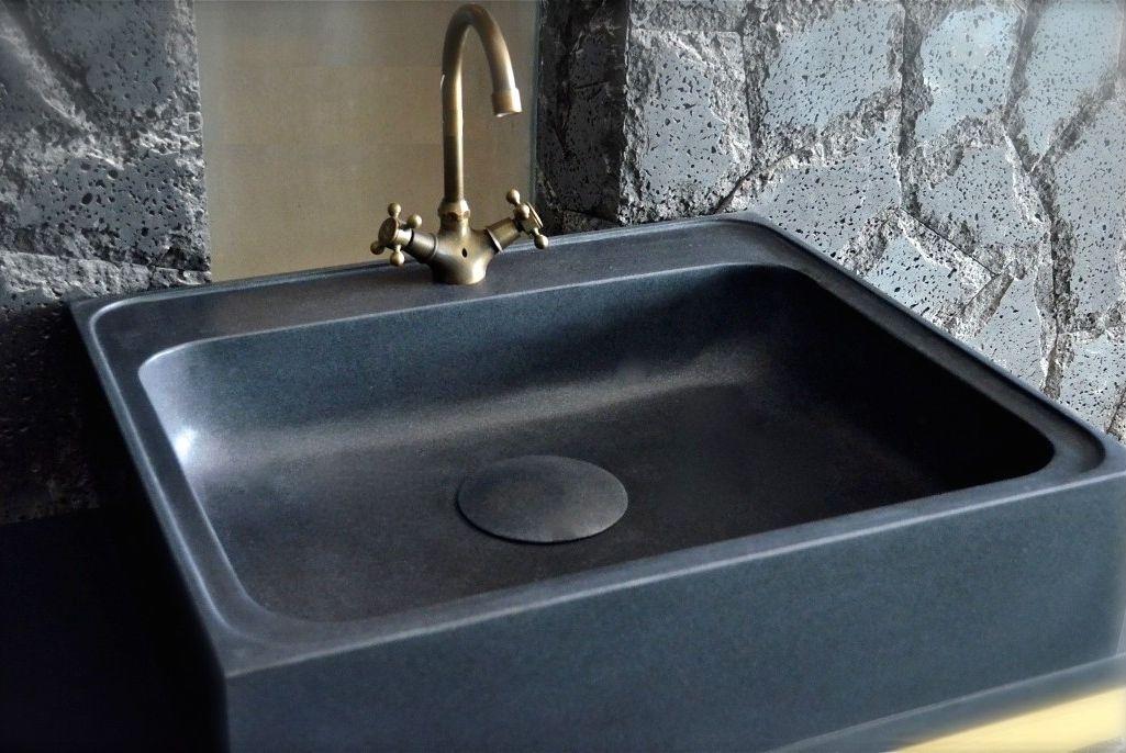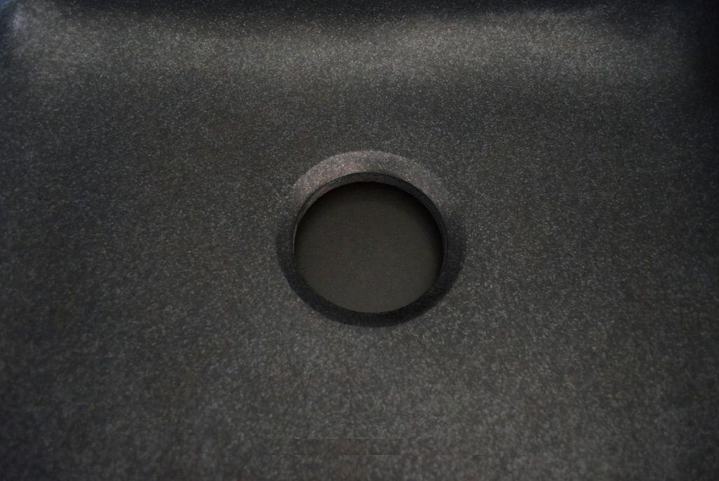 На первый взгляд кажется, что мойка выполнена из искуственного материала на основе гранитной крошки, но это только видимость. Изделие вырезано из цельного блока натурального черного гранита Shanxi Black. На завершающем этапе камень приобрел лощеную фактуру поверхности, дающую этот бархатистый матовый блеск.