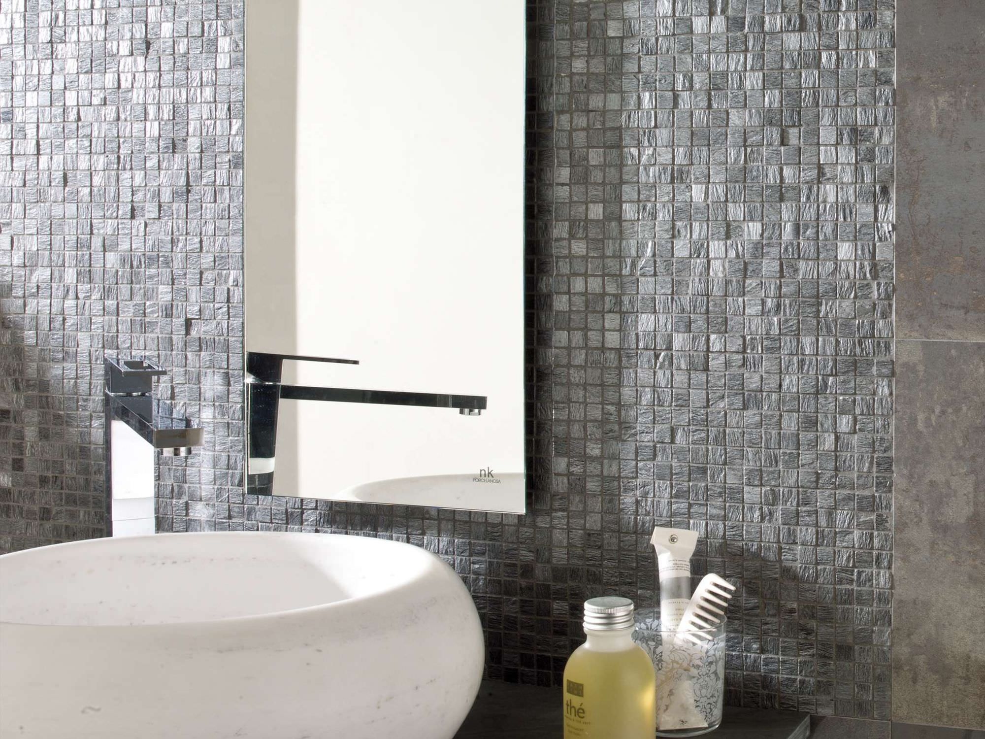 Мозаика изготовлена из мельчайших квадратиков сланца Silver Shine Slate. Металлическое мерцание камня удивительно органично смотрится в светлом интерьере ванной комнаты.