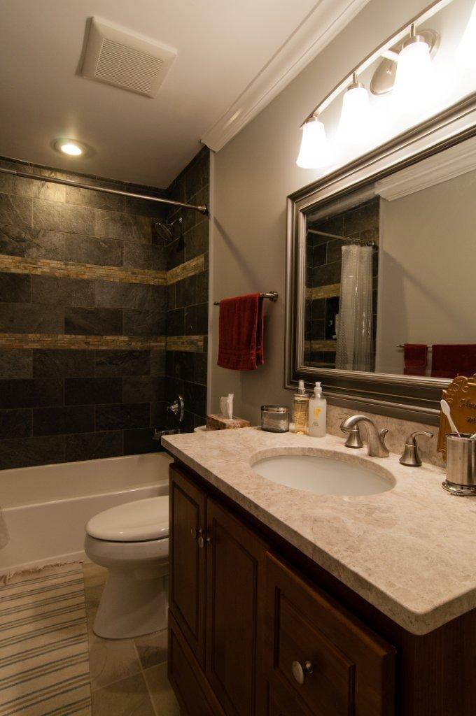 Стены вокруг ванны облицованы кварцитосланцем Silver Shine Slate - мерцающим, серебристо-графитовым, камнем с колотой, рельефной фактурой. Поверхность камня сохранила естественный, необработанный скол, что придает отделке изысканную небрежность. Серая отделка декорирована полосами из частиц более светлого сланца.