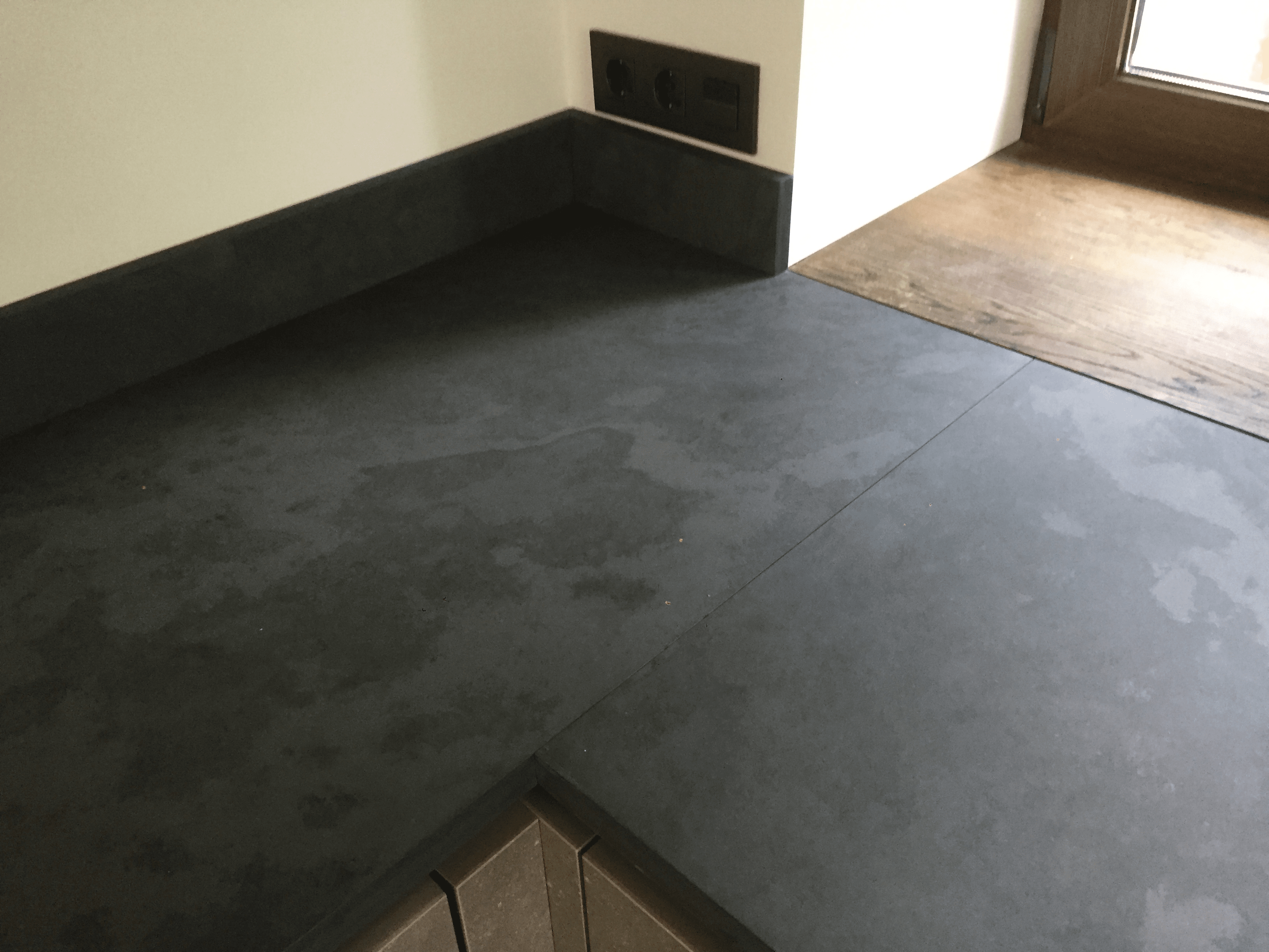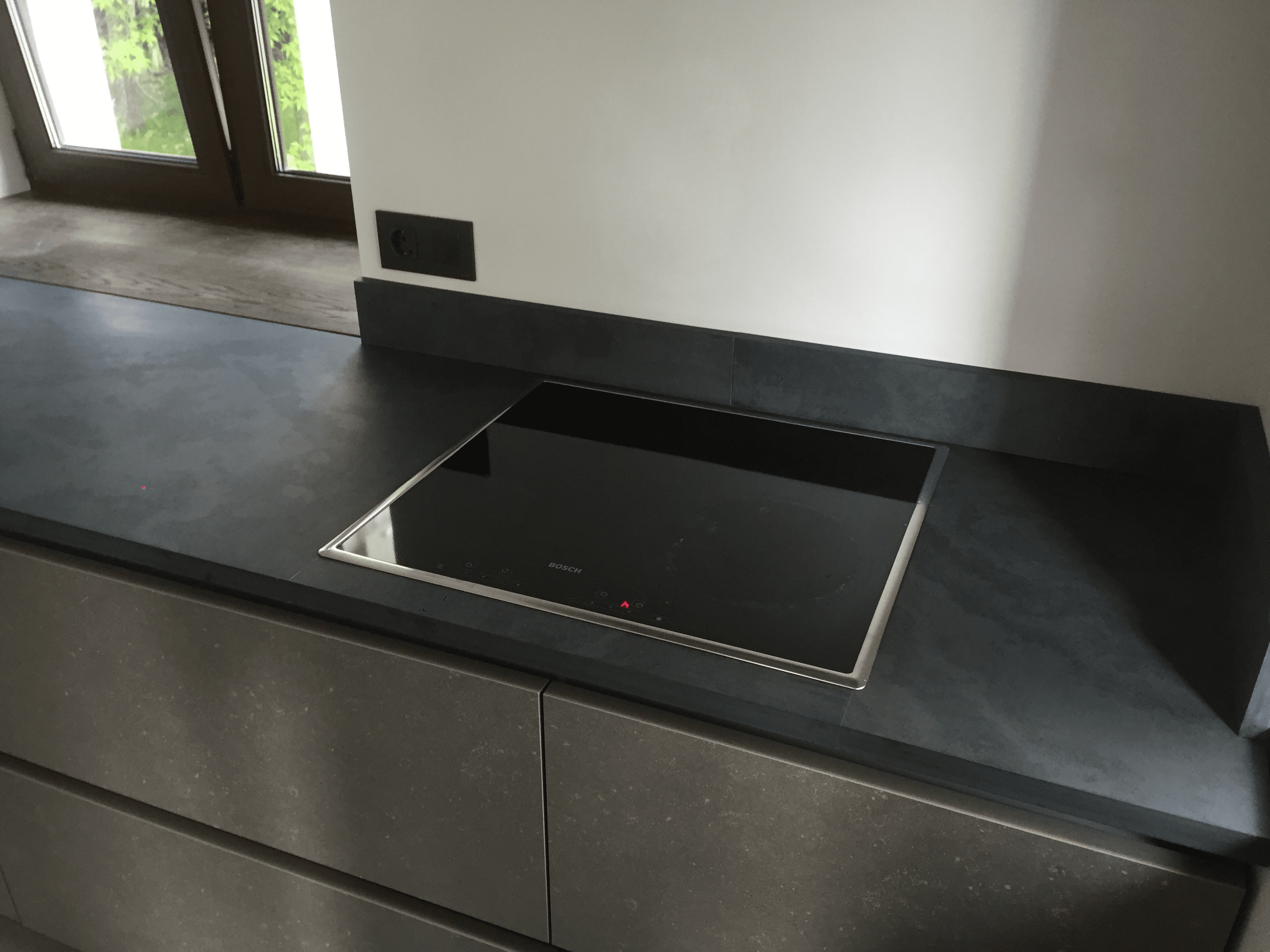 Столешницы покрывают все поверхности рабочей зоны. Они выполнены из 3-сантиметрового слэба Black Slate с матовой фактурой. По периметру стены идет невысокий фартук. Заказчик предпочел отказаться от мастиковки зоны швов на изделии, поэтому они видны невооруженным глазом.