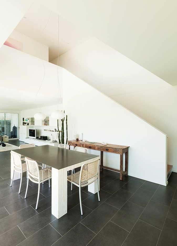 Черный сланец на полу - уже устойчивая, проверенная временем, тенденция интерьерной моды. Этот скромный и лаконичный камень цвета асфальта - неотъемлемая часть современного дизайна. Его матовая, бархатистая фактура ненавязчиво привлекает внимание. Его простой и стильный облик приходится по душе ценителям минимализма, эко-дизайна и интерьеров в темных тонах. Он органичен с другими отделочными материалами, да и весьма устойчив к механическим нагрузкам.