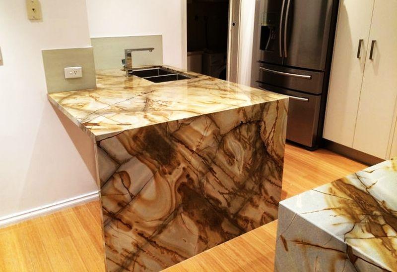 Все кухонные стойки выполнены из необычного камня - итальянского кварцита Spiderman. Они представляют собой Г-образные конструкции, собранные из двух плит кварцита, расположенных под углом в 90 градусов. Столешницы такого типа являются неотъемлемой частью современного кухонного дизайна. Они выглядят стильно и органично, но требуют большего расхода камня (за счет ноги из цельной плиты камня).