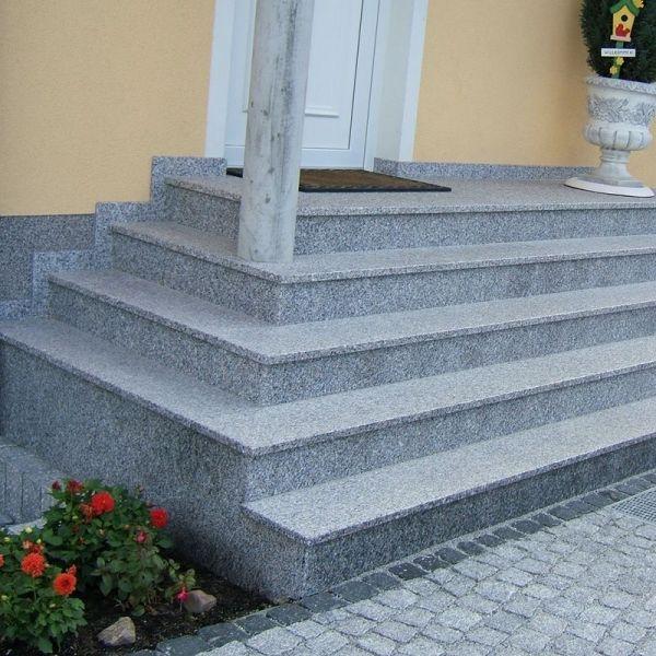 Входная лестница загородного дома выполнена из гранита Rosa Beta. Обработка камня — шлифовка, что является лучшим выбором для экстерьерных лестниц, так как снижает риск скольжения. Однако в такой обработке гранит Rosa Beta теряет свойственный ему нежно-розовый оттенок.