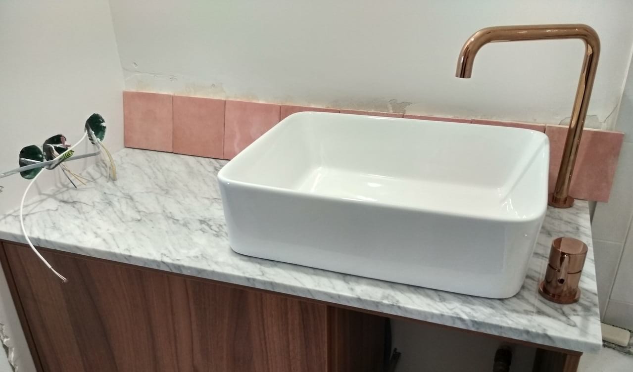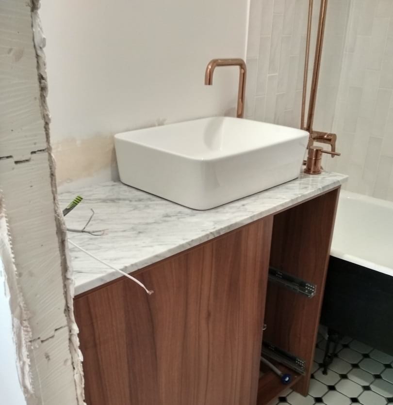 Изготовление столешницы в ванную из остатка Bianco Carrara C (серая Каррара).