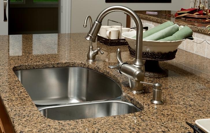 Кухонная столешница выполнена из полированного гранита Carioca Gold. Это надежный камень, который органичен в любом проекте.