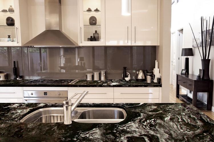 Проект современной кухни в черно-белом цвете. С целью придания интерьеру некой динамики было решено выбрать необычный камень для кухонных рабочих поверхностей. Выбор остановился на граните Atacama Black. В полированном виде максимально раскрывается необычная красота этого камня.