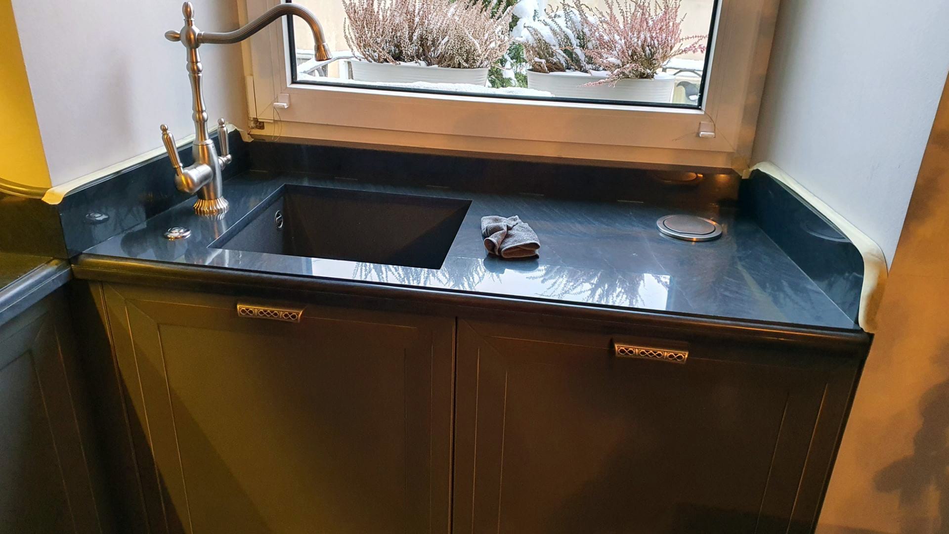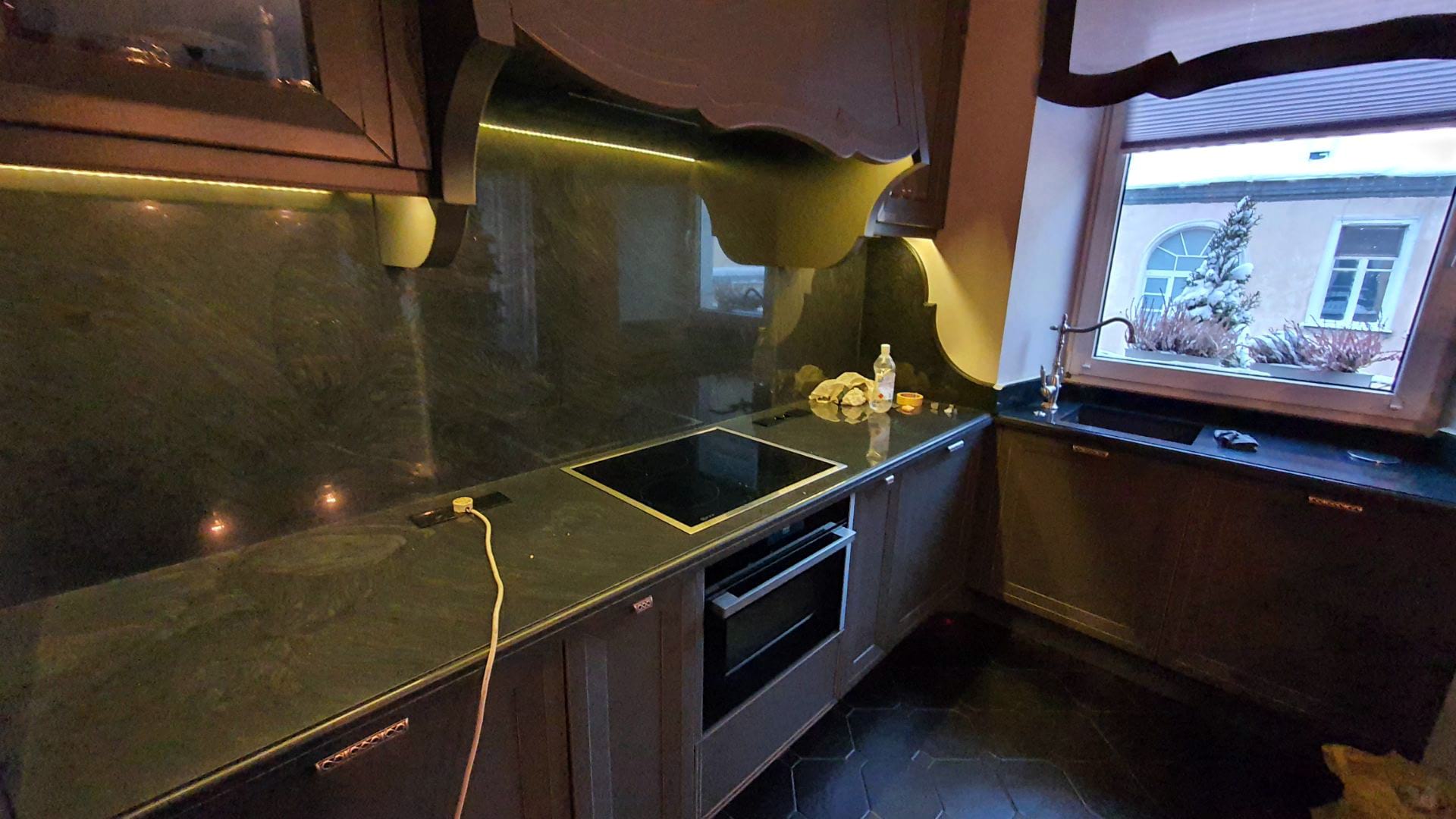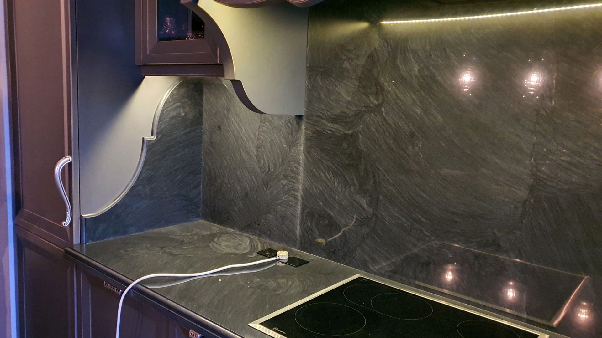 Изготовление и монтаж кухонной столешницы и острова из черного кварцита Brilliant Black.