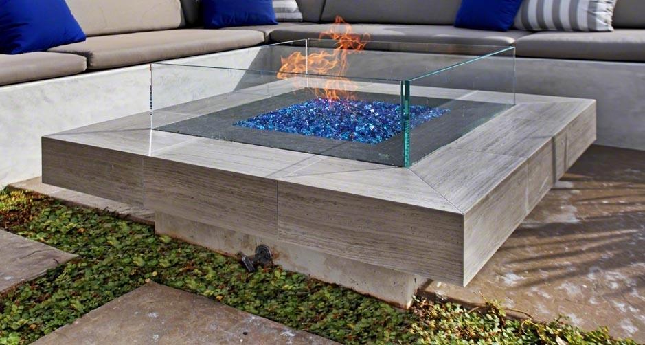 Обратите внимание на центральную часть композиции - панорамный камин открытого типа, основание которого облицовано серым полосчатым травертином Travertine Silver.