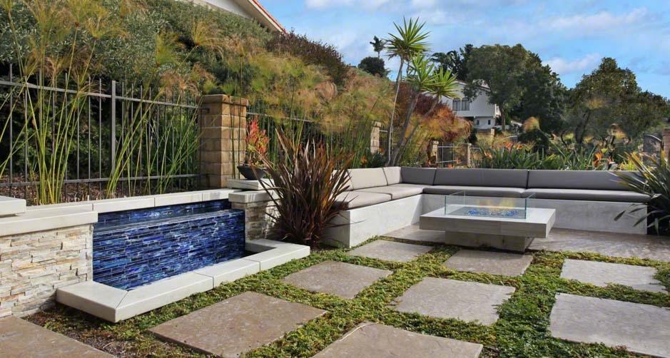 Архитектор выбрал привлекательный вариант для мощения территории: квадратные плиты Travertine Walnut разложены с зазорами, заполненными растительностью.