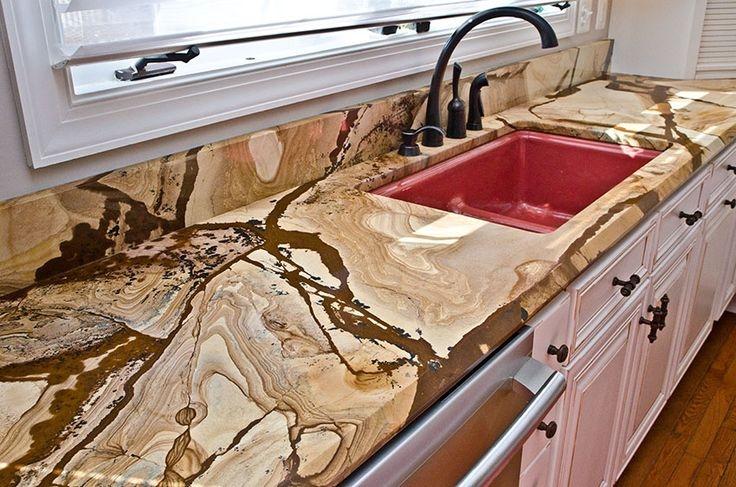 Из Stone Wood вырезаны поверхности и фартуки рабочей зоны по периметру кухни, а также столешница центрального стола-острова. Заказчик настаивал на минимальном количестве стыков на изделии, поэтому крупные плиты вырезались из слэбов толщиной 30 мм.