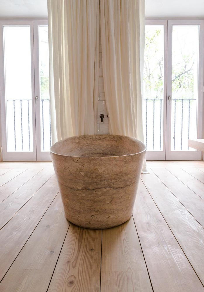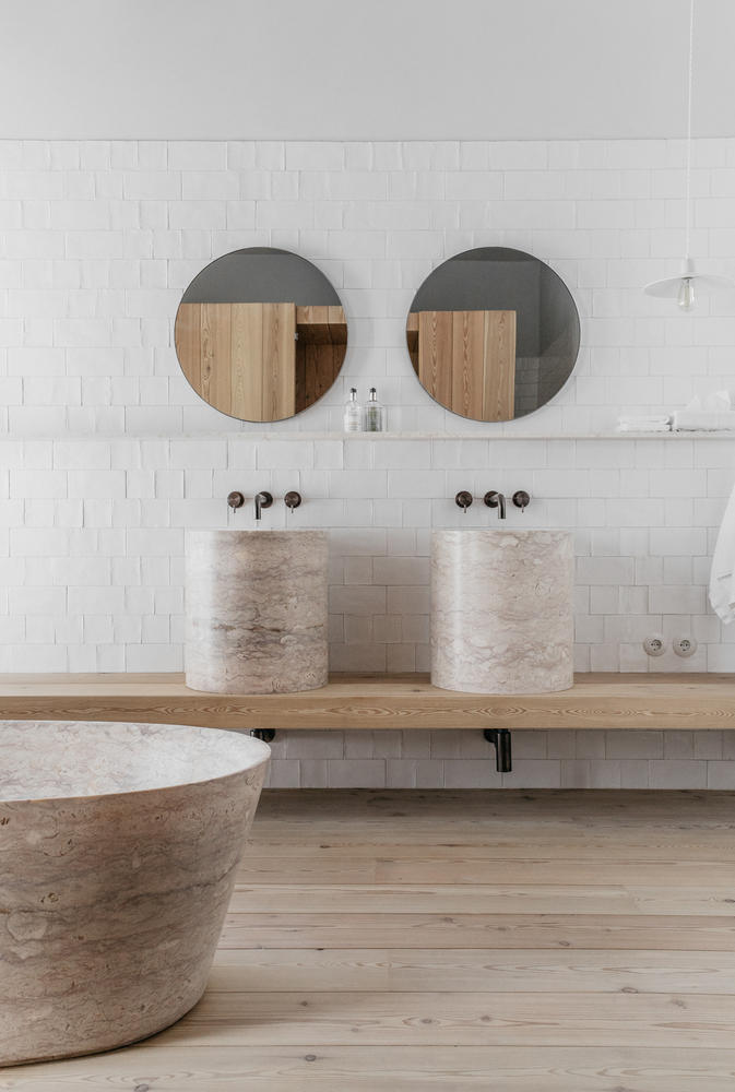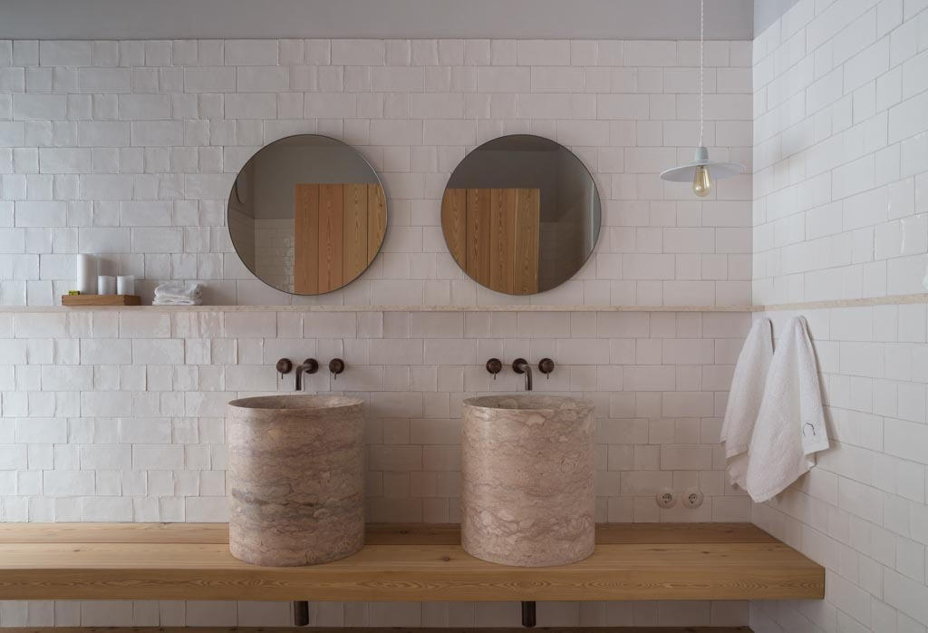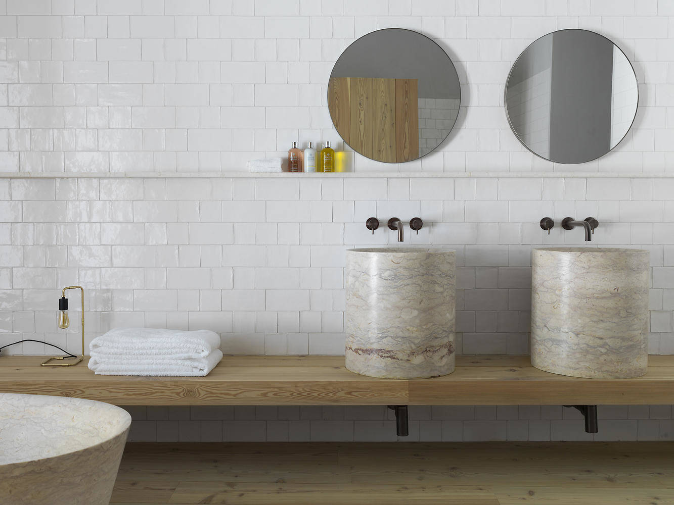 Белый кафель с «бумажной» фактурой, деревянные пол и столешница, абсолютно круглые зеркала. А вот сантехника... поистине произведение каменного зодчества. Две раковины и крупная ванна вырезаны из цельных блоков травертина Travertino Striato.