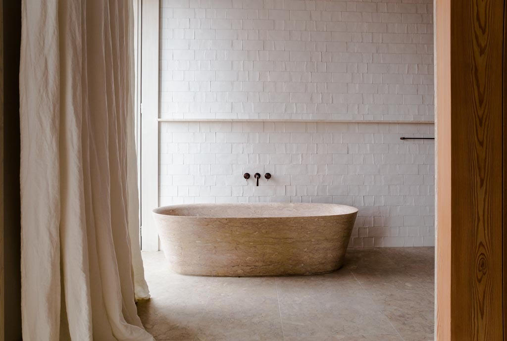 Это долгий и кропотливый труд — создать идеальное изделие из такого довольно пористого и трещиноватого камня. И раковины, и ванна смотрятся благородно и элегантно, завораживая бархатистой поверхностью с изысканным рисунком прожилок и переходами цвета в бежево-серой гамме.