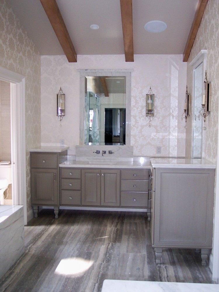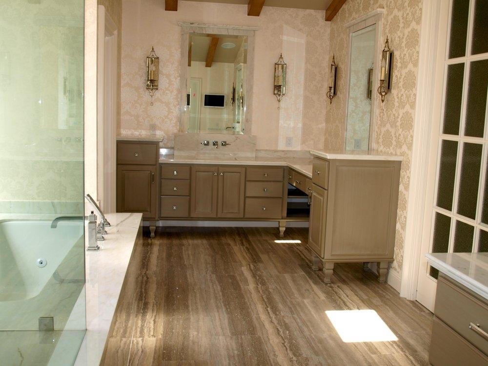 Для отделки пола в ванной комнате были использованы плиты Travertino Striato с выраженной полосчатостью (распиловка Vein Cut). Монтажники пытались сохранить цельность рисунка, но не удалось - стыки между плитами заметны невооруженным глазом. Поэтому в таких случаях мы рекомендуем облицовку цельными слэбами или плитами очень крупного формата.