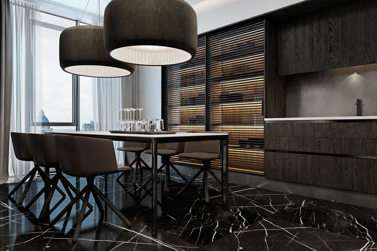 Изысканный мрамор Nero Marquina в сочетании с темным деревянным паркетом слагает пол по периметру всей квартиры. Этот мрамор является одним из самых дорогих и ценных разновидностей природного камня. Его использование в интерьере громко заявляет о том, что домовладелец склонен выбирать для себя самое лучшее. Как правило, такие проекты не поднимают вопрос экономической оправданности предметов жилого декора.