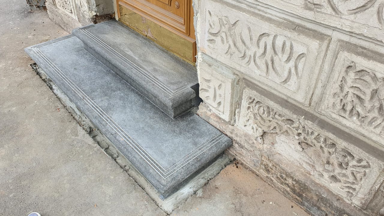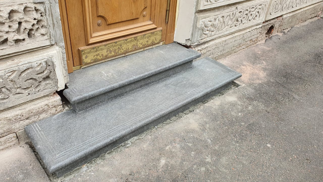 Изготовление и монтаж пяти цельных ступеней из гранита G684 Berry Black. Толщина ступеней 170-190мм, а на поверхности каждой ступени были вырезаны канавки глубиной 6мм. Обработка поверхности - термление.