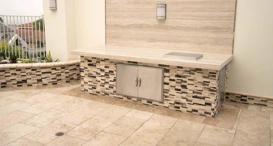 В данном проекте речь шла о кухне, расположенной на террасе загородного дома в одной средиземноморской стране. Пол террасы облицован травертином Travertine Cream нежного пастельного оттенка. Здесь использовались прямоугольные плиты с фактурой антик - состаренные, шероховатые, без блеска. Но особенно примечательна столешница с фартуком, покрытая тем же травертином, но уже с полосчатым рисунком (распиловка Vein Cut).