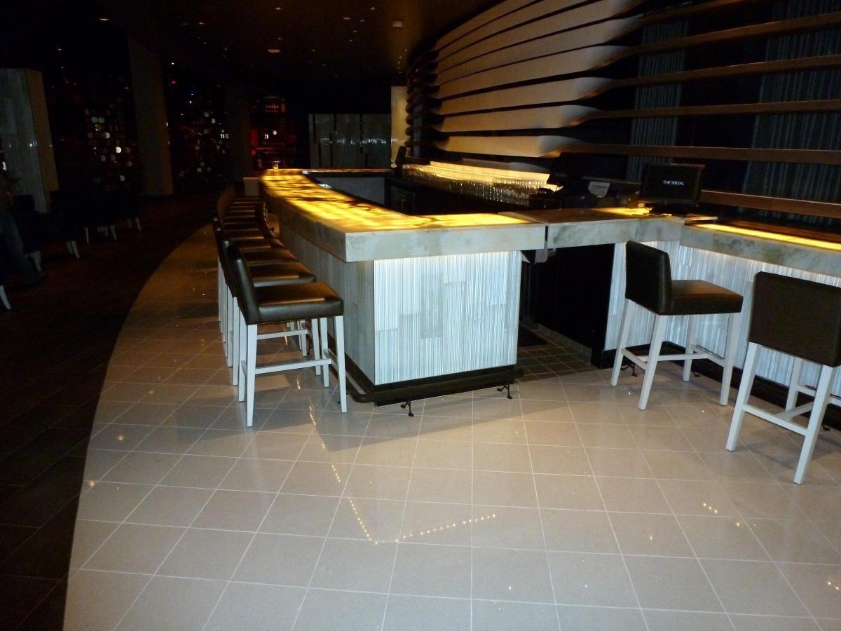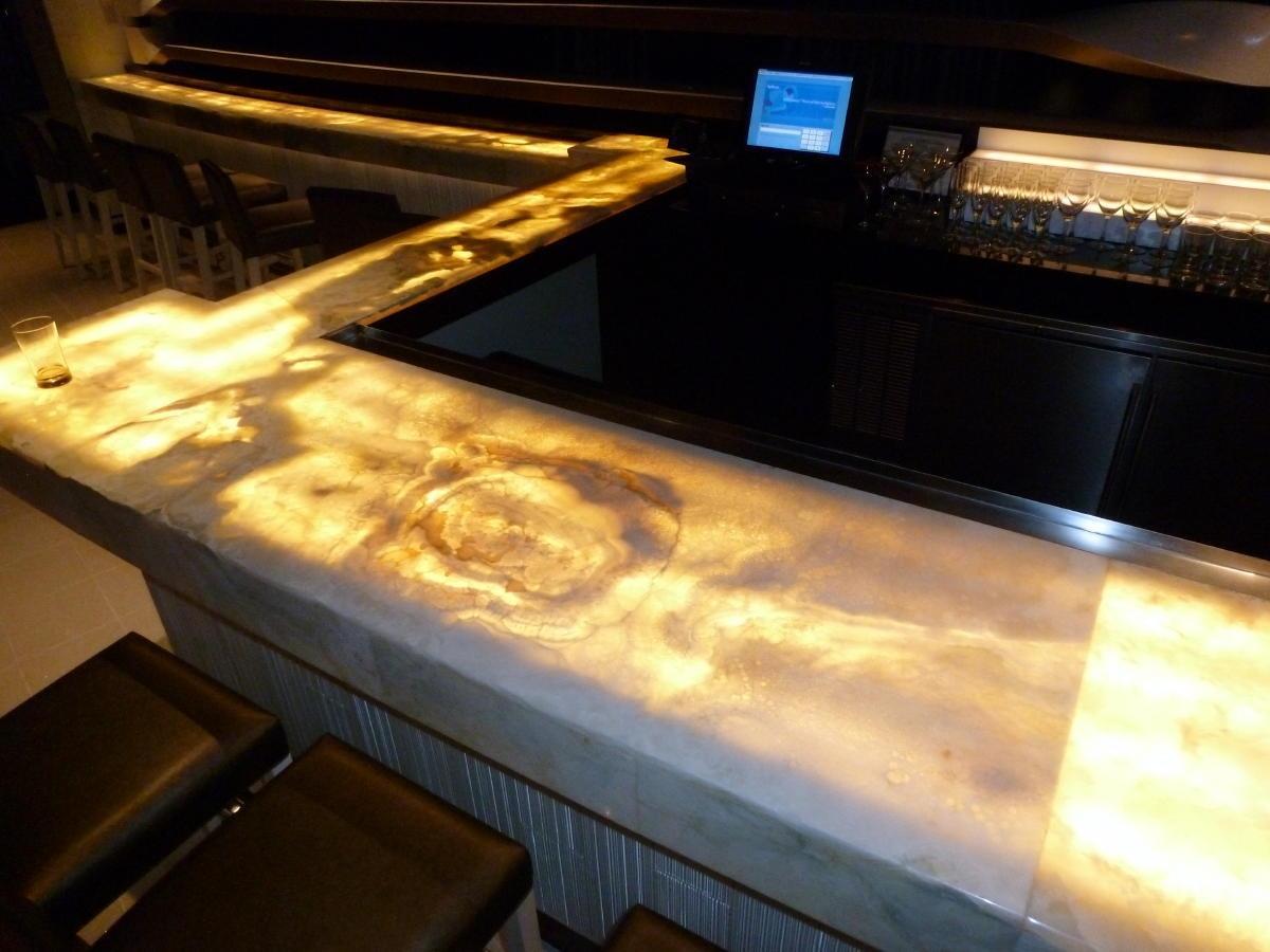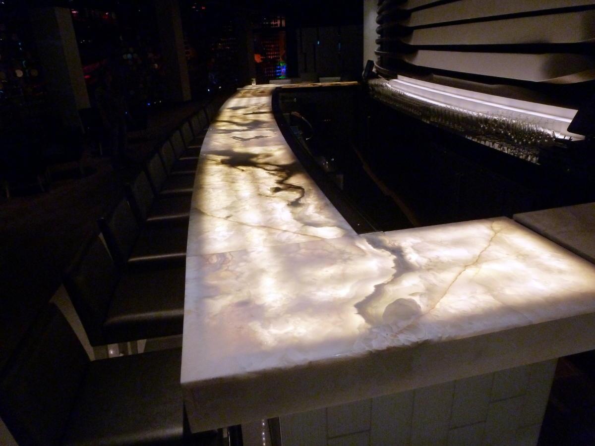 Подсвеченная изнутри столешница элегантного бара выполнена из Onyx Bianco. Камень прекрасно пропускает свет, чем и воспользовались дизайнеры проекта. Свет, пропущенный через тонкий срез камня, создает приглушенную атмосферу. Помещение нуждается лишь в незначительных локальных источниках дополнительного освещения.