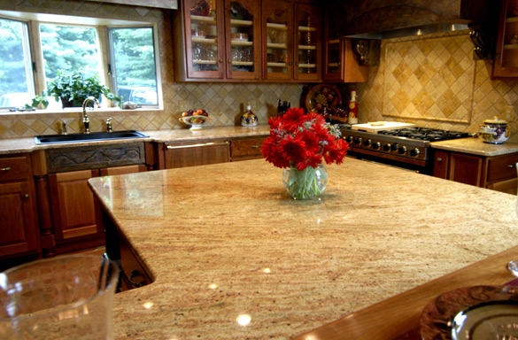 Обеденный стол и все рабочие поверхности этой кухни выполнены из полированного гранита Madura Gold. Камень с выразительной полосчатой текстурой становится ярким украшением интерьера.