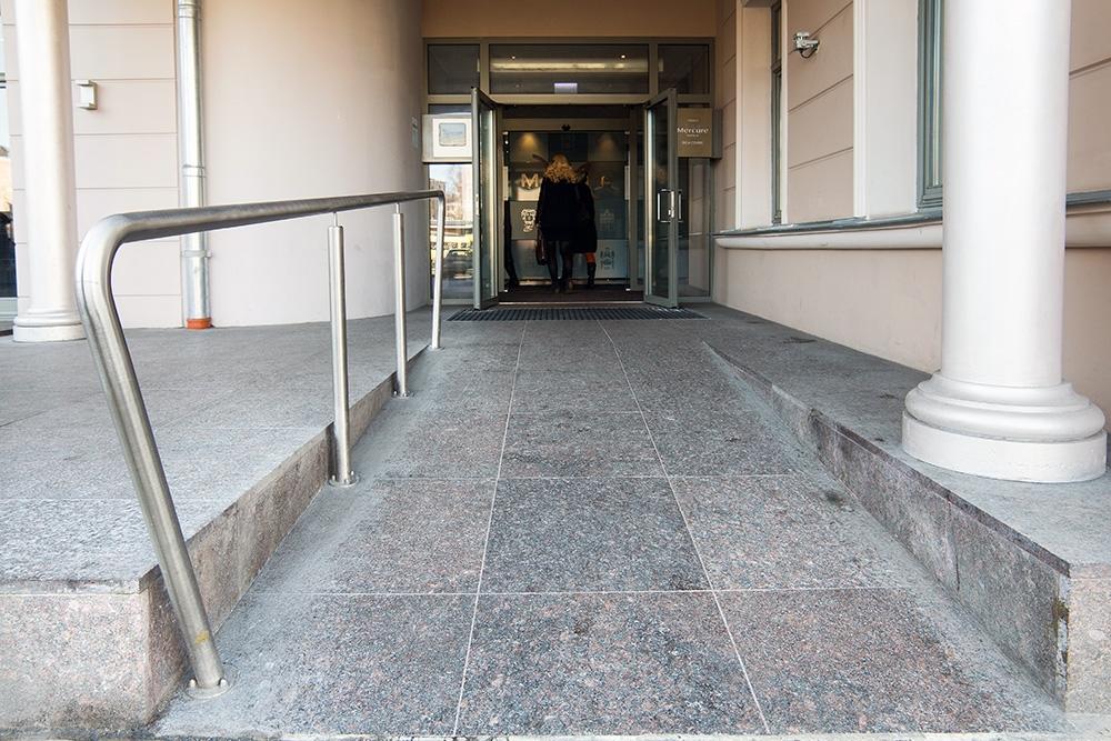 Мы видим входную группу маленького европейского отеля. Площадка перед зданием и пандус выполнены из популярного и проверенного временем гранита Tan Brown. Для отделки использовалась 2-сантиметровая плитка с термообработанной фактурой поверхности.