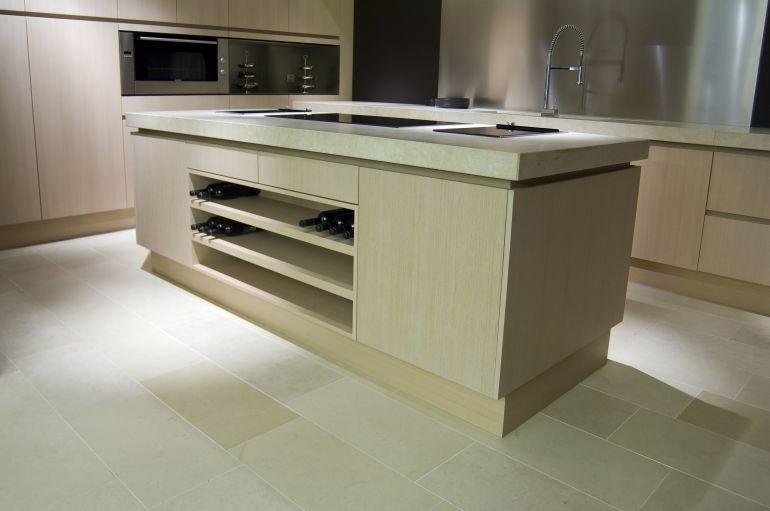 Тунисский известняк не часто применяется для создания мебели, но здесь дизайнер пошел на свой страх и риск. Не самый плотный и твердый камень на кухонном столе рискует потерять свой первозданный вид и даже целостность структуры.