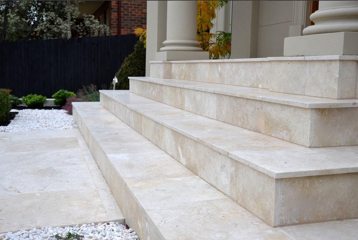 Для данного проекта было решено задействовать травертин не замастикованный, сохранивший естественные каверны и полости. Такой камень смотрится потрясающе, в духе "антик", но и требует бережного к себе отношения. Уличная грязь и влага заполняют поры камня, приводя к его старению и преждевременному разрушению.