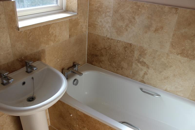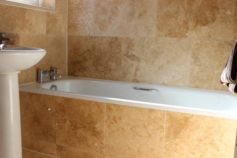 Ванная комната отделана просто, но элегантно - плитами травертина Travertine Classic. Этим камнем облицованы пол и стены, а также постамент, обрамляющий ванну.