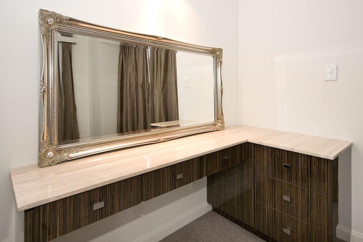 Столешница покрывает тумбу туалетного столика Г-образной формы. Изделие вырезано из цельного 3-сантиметрового слэба полированного травертина Travertine Light, оно лишено стыков и швов. Рисунок камня волнисто-полосчатый, который раскрывается при распиле Vein Cut (направление распиловки от блока - вдоль прожилковатости). Такая текстура широко востребована по причине своей декоративной привлекательности.
