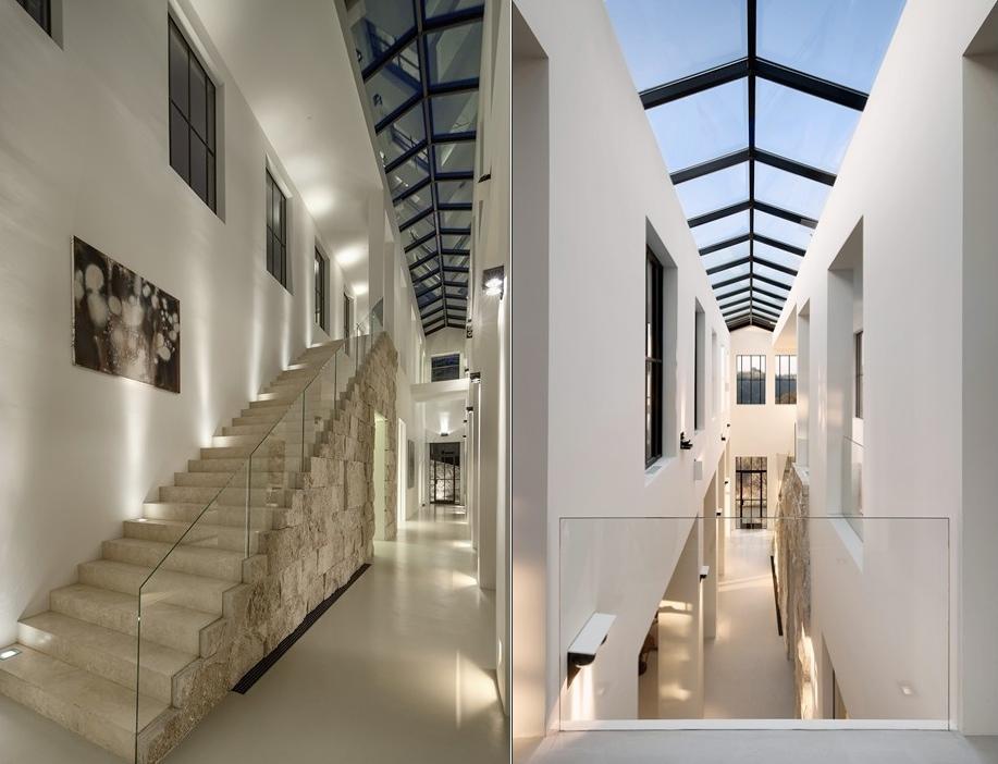 В интерьере же травертин встречается локально. Им облицованы части стен, пола, а также лестница. Из травертина выполнены столешницы и раковины.