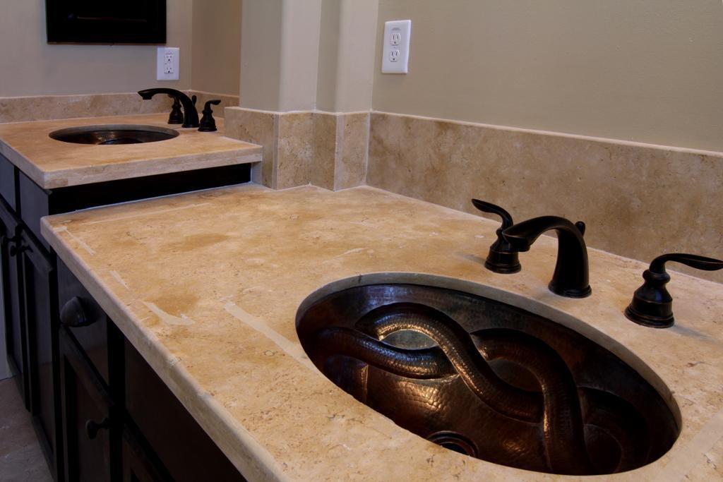Заказчик выбрал бежевый Travertine Classic для комплексной облицовки ванной комнаты. Здесь использовался травертин с неравномерным, узорчатым рисунком, что говорит о направлении распиловки слэба Cross Cut (поперек прожилковатости). Лощеная фактура поверхности придает камню более мягкий, бархатистый вид. Лишенный блеска, пористый и матовый травертин способствует спокойной, интимной обстановке в помещении.