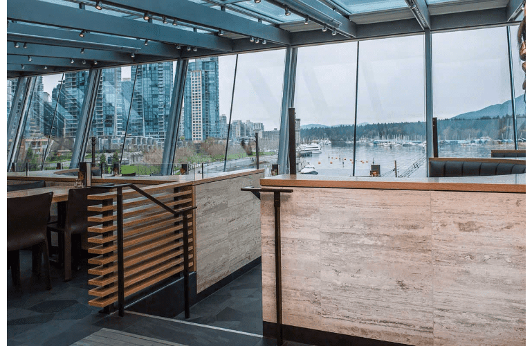 Перед нами интерьер современного европейского ресторана. Помимо удачного расположения на реке, заведение интересно и своим дизайном. Который воплощен с помощью натуральных материалов и сплошных панорамных окон.