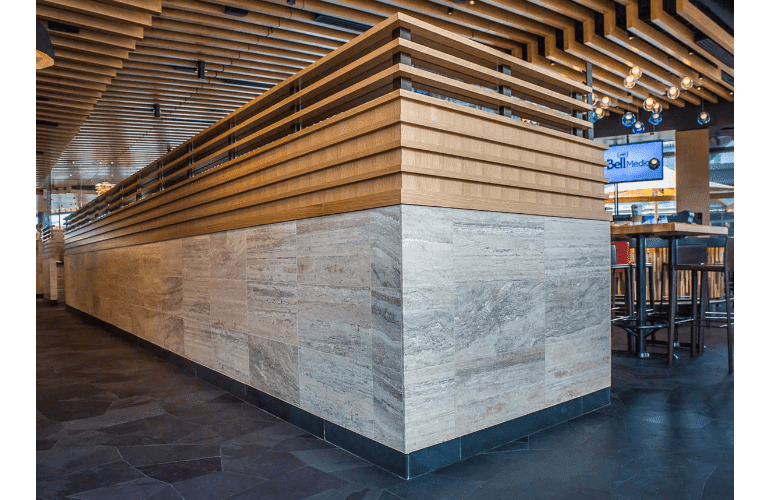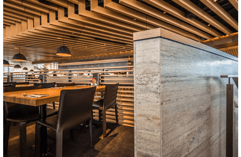 Стеновые панели, перегородки и фасады барных стоек облицованы плиткой итальянского травертина Travertino Striato. Для проекта была заказана крупная плитка с полосатым рисунком - метод распиловки Vein Cut. Этим же камнем облицованы балюстрады лестниц.