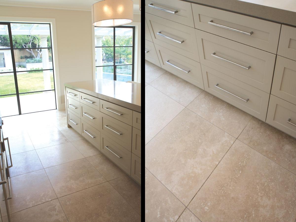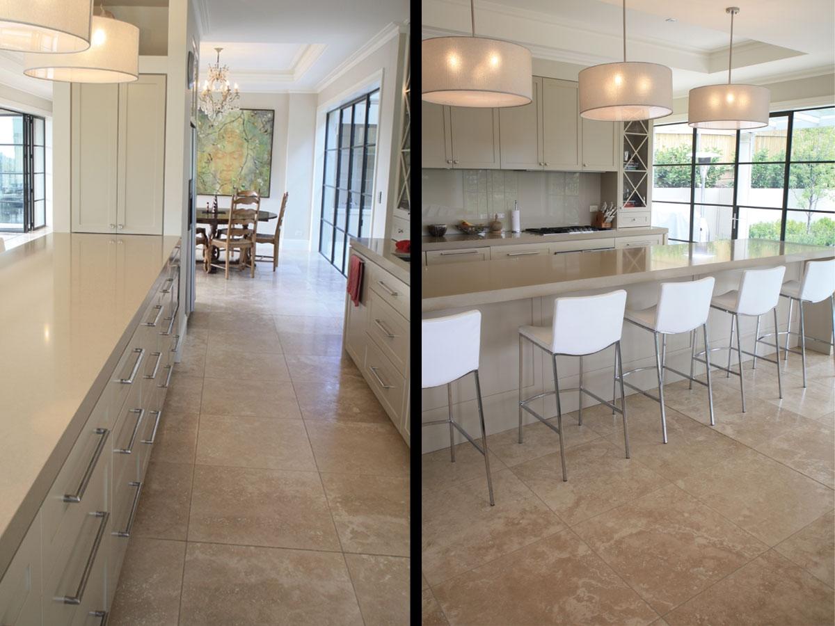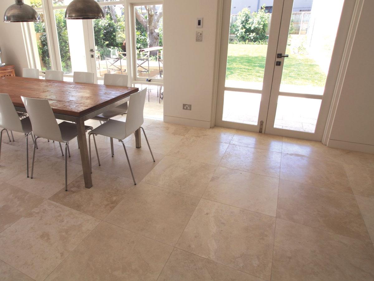 Пол в загородном доме облицован крупной квадратной плиткой травертина сорта Travertine Cream. Лощеная фактура поверхности камня придает ему необыкновенную бархатистую поверхность без блеска.