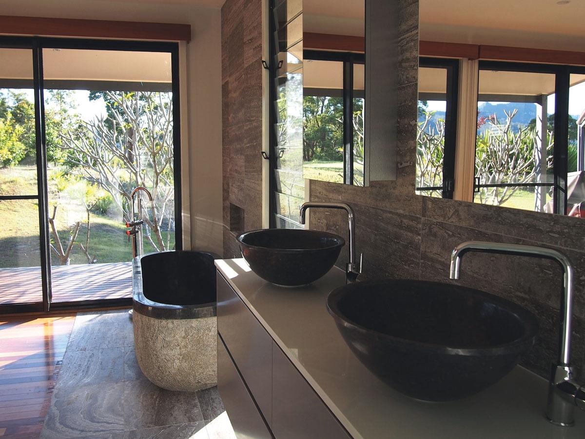 Необычный интерьерный проект ванной комнаты в загородном доме. Ванная снабжена стеклянными дверьми и панорамными окнами от пола до потолка, выходящими на улицу. Обилие дневного света позволило выбрать темный отделочный материал, который органично смотрелся бы с деревянным паркетом.