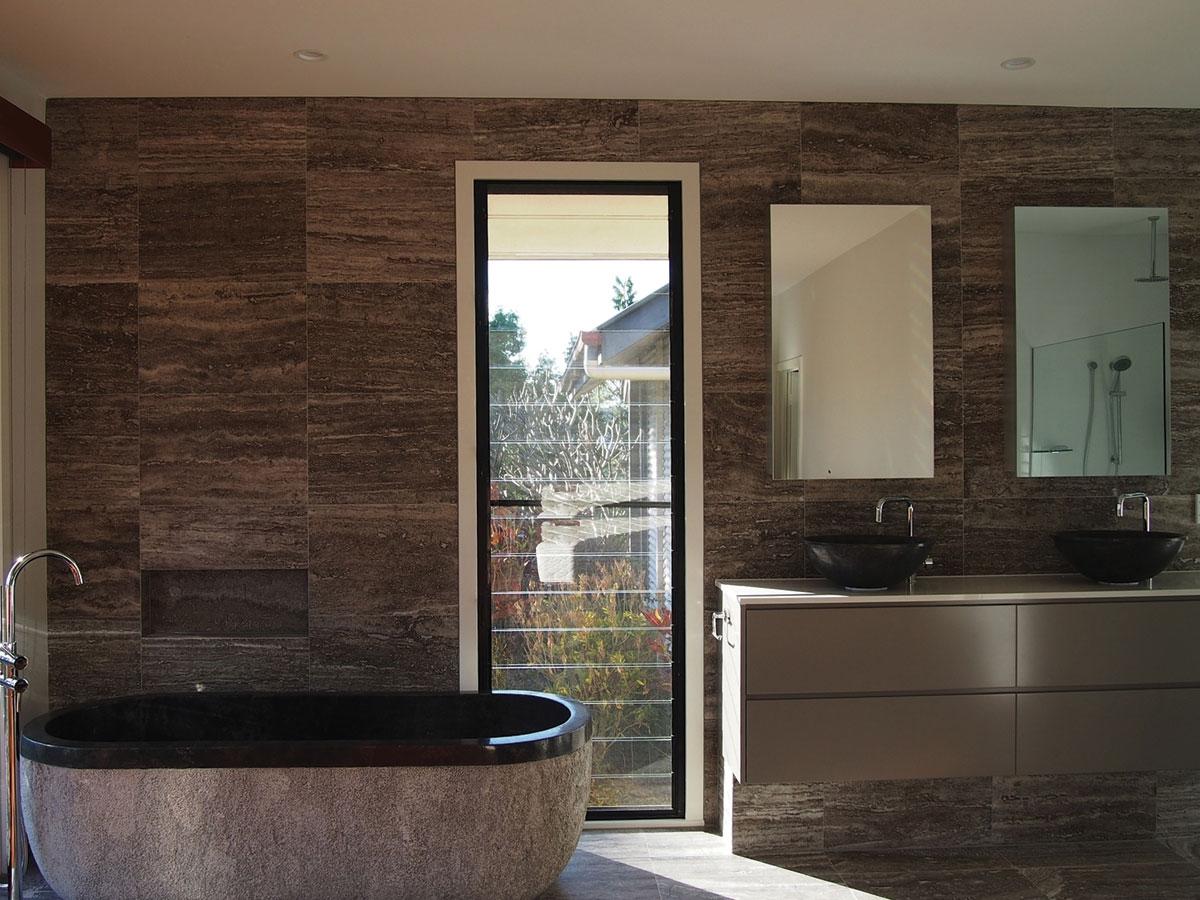 Увидев Travertine Noche, заказчик твердо решил выбрать его для облицовки стен и пола. Был выбран формат крупной плитки с направлением распиловки Vein Cut. Согласитесь, параллельно-полосчатый рисунок выглядит естественно и в то же время очень элегантно.