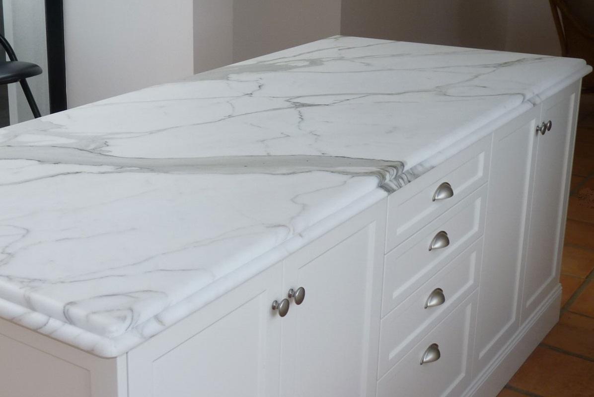Столешница кухонного острова изготовлена из мрамора Calacatta Vagli - классики итальянской каменной промышленности. Это белоснежный скрытокристаллический мрамор с легким свечением и неоднородным рисунком светло-серых прожилок. Является одним из самых востребованных видов природного камня.