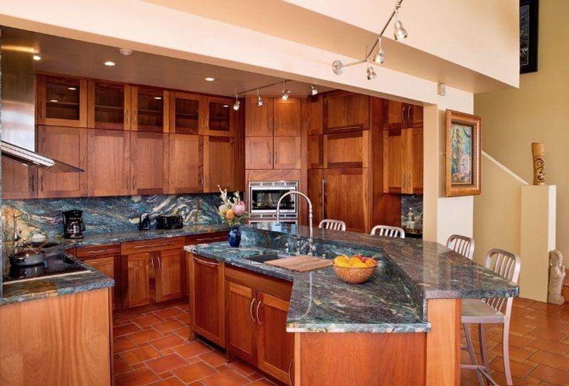 Этим камнем покрыты все столешницы кухни: как по периметру рабочей зоны, так и на двухуровневой барной стойке, расположенной по центру. Им же облицованы стены.