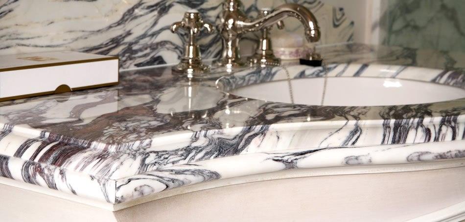 Но самым ярким элементом всего пространства стала столешница для раковины из мрамора Calacatta Viola. Столешница была выполнена по уникальному проекту, разработанному дизайнером, в стиле модерн. Резная округлая форма стола и небольшого фартука формирует очень необычный для нашего времени дизайн. Стилистика изделия перекликается со стилем мебели в ванной - тумбы и мраморной скамьи. Поверхность столешницы вырезана из слэба толщиной 3 сантиметра и укреплена дополнительной подклейкой снизу.
