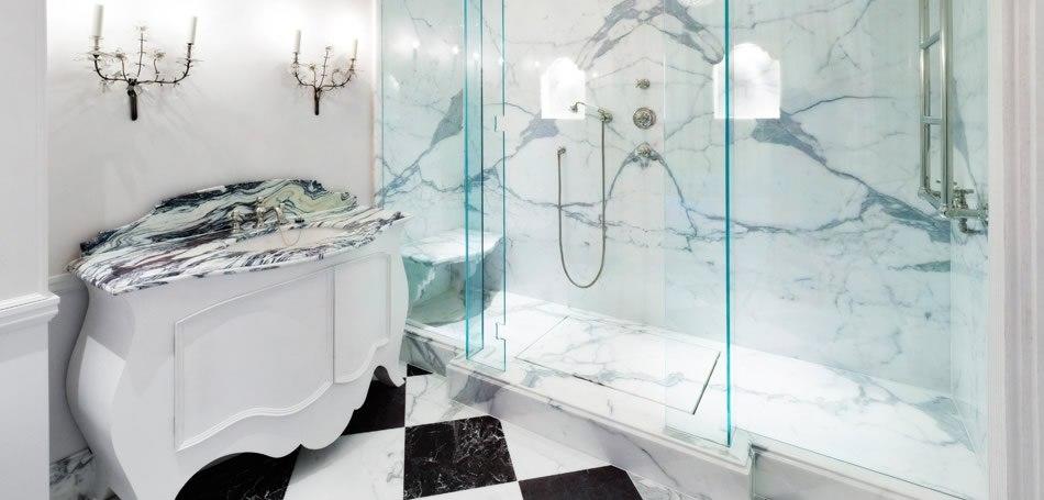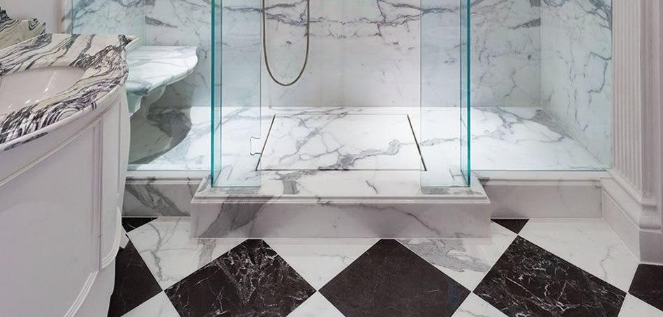 Bianco Statuario стал основным фоном - материалом стен и пола. Этот белоснежный камень высокодекоративен и в то же время скромен. Особено эстетичен этот камень в формате крупных плит. Для отделки стены в душевой кабине были заказаны два слэба, слагающие крупную "бабочку" (т.е. вид отделки, когда рисунок одной плиты зеркально симметричен рисунку другой). Также из Bianco Statuario была вырезана скамейка, утсновленная в душевой кабине.
