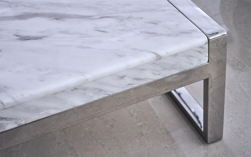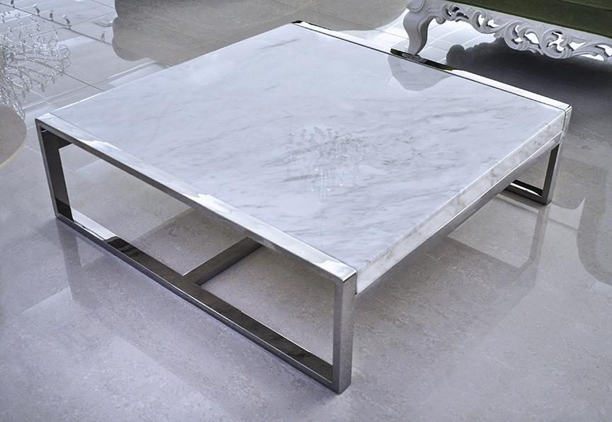 Элегантный и простой кофейный столик, состоящий из металлического каркаса и квадратной плиты мрамора Volakas. Удивительно, почему современный дизайн интерьеров так мало внимания уделяет таким эргономичным и стильным изделиям..